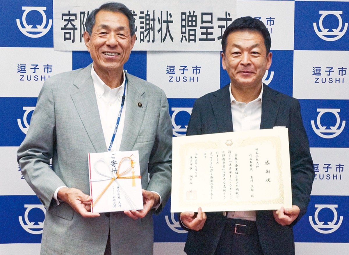 総合建設業の株式会社大神(横須賀市)が逗子市に、企業版ふるさと納税制度を使い50万円を寄付した。7月7日に岩崎次郎社長が市役所を訪れ、桐ケ谷覚市長に手渡した。同社の寄付は3年連続で寄付額は累計150万円になった。