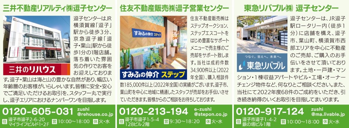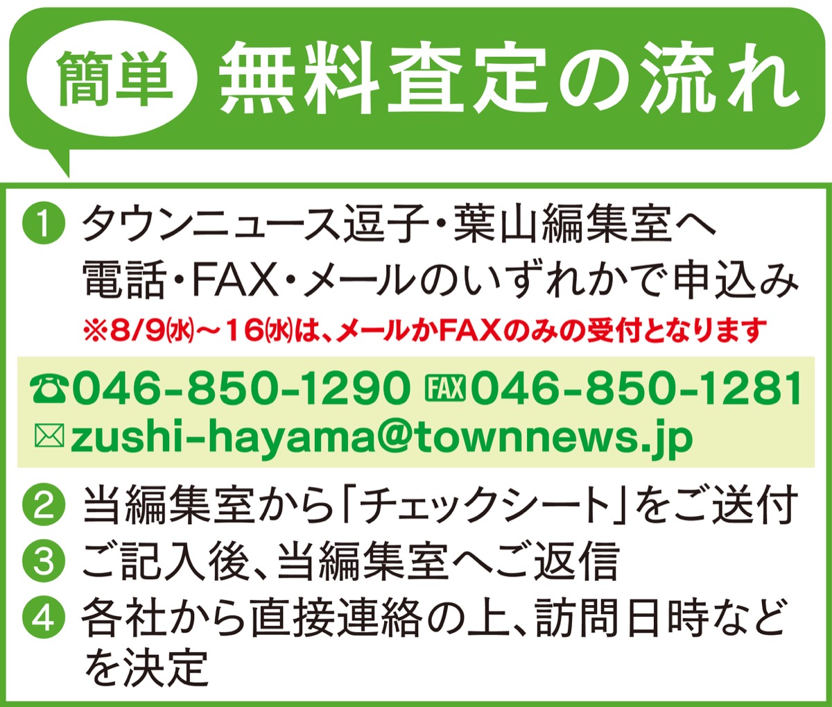 本紙では夏の特別企画として、不動産大手の3社(東急リバブル(株)逗子センター、三井のリハウス逗子センター、住友不動産販売(株)逗子営業センター)と協力し不動産を無料査定。本紙が取り次ぎ3社一括で依頼することで、自宅の資産価値を比較でき、各社の視点を踏まえ今後の住まいや不動産全般の相談も可。まず当編集室へお問合せを(左記)。