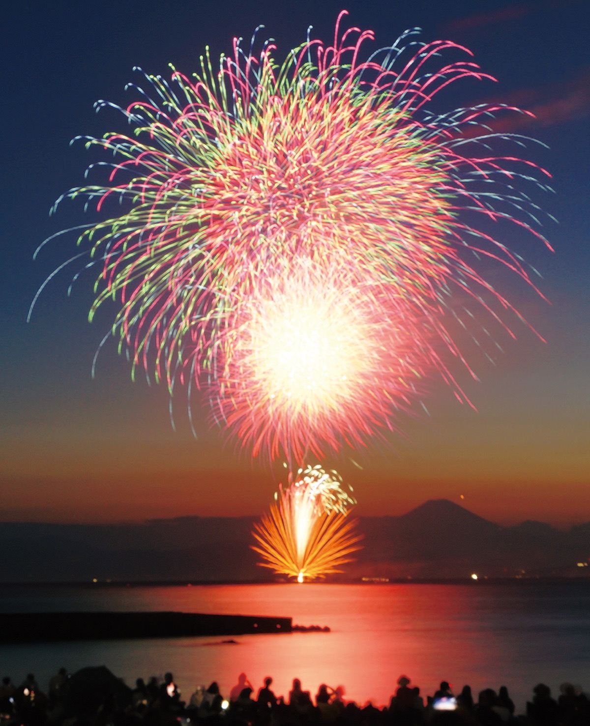まだうっすらと富士山の影が浮かび上がる午後7時30分、実行委員長の山梨崇仁町長によるカウントダウンで花火が打ちあがると、浜辺に集まった約3万1000人の観客から一斉に歓声が上がった。