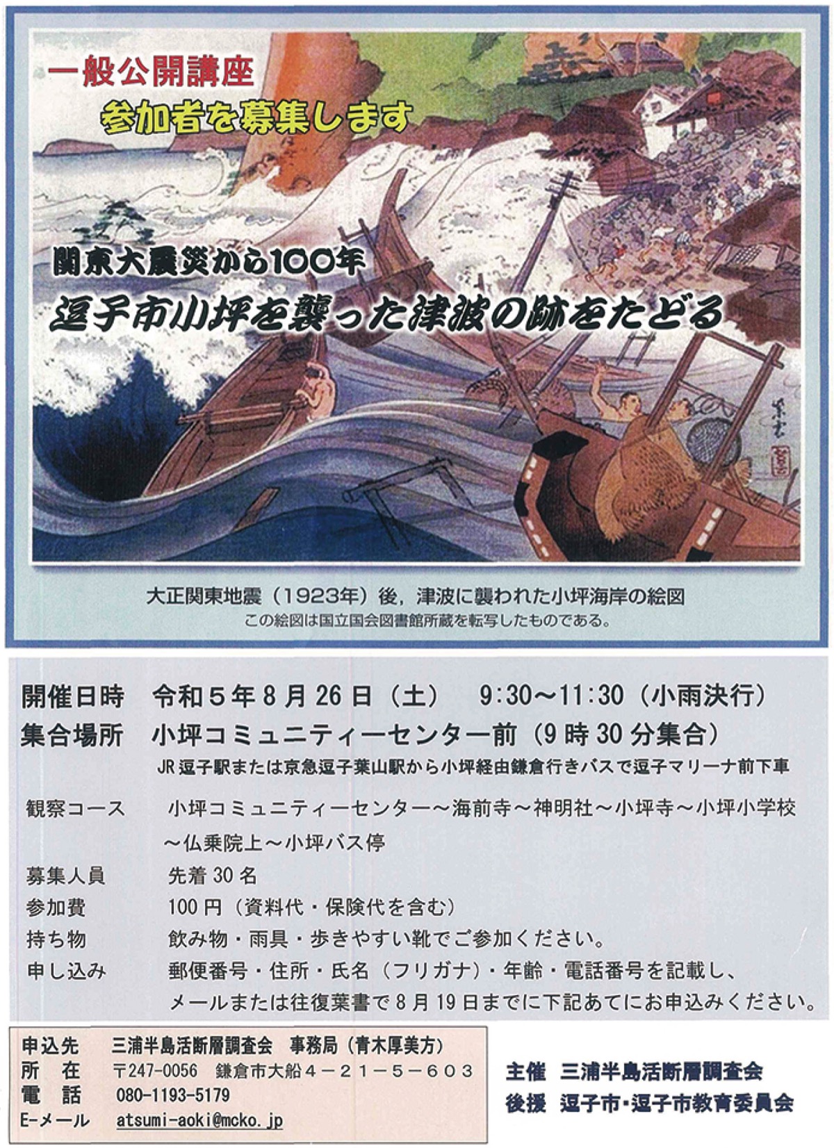 観察会参加希望者は郵便番号・住所・氏名(フリガナ)・年齢・電話番号を明記し、三浦半島活断層調査会事務局(鎌倉市大船4の21の5の603青木厚美方/【メール】atsum
