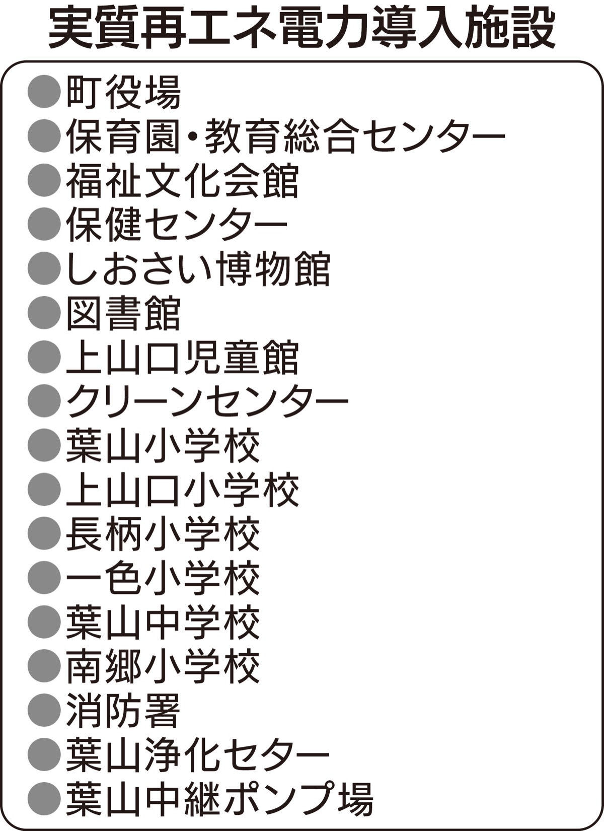 今年3月に導入済みの、葉山中継ポンプ場、葉山浄化センターの2施設の年間電力使用量約240万kWh(キロワットアワー)と合わせ、年間約500万kWhが実質再エネ電力に切り替わった。これは町所有施設の総電力使用量約579万kWh(2021年度実績)の約87・1%にあたる。町の公共施設では年間約3400tのCO2を排出しているが、電力の切り替えにより、年間約2396tの削減となる。