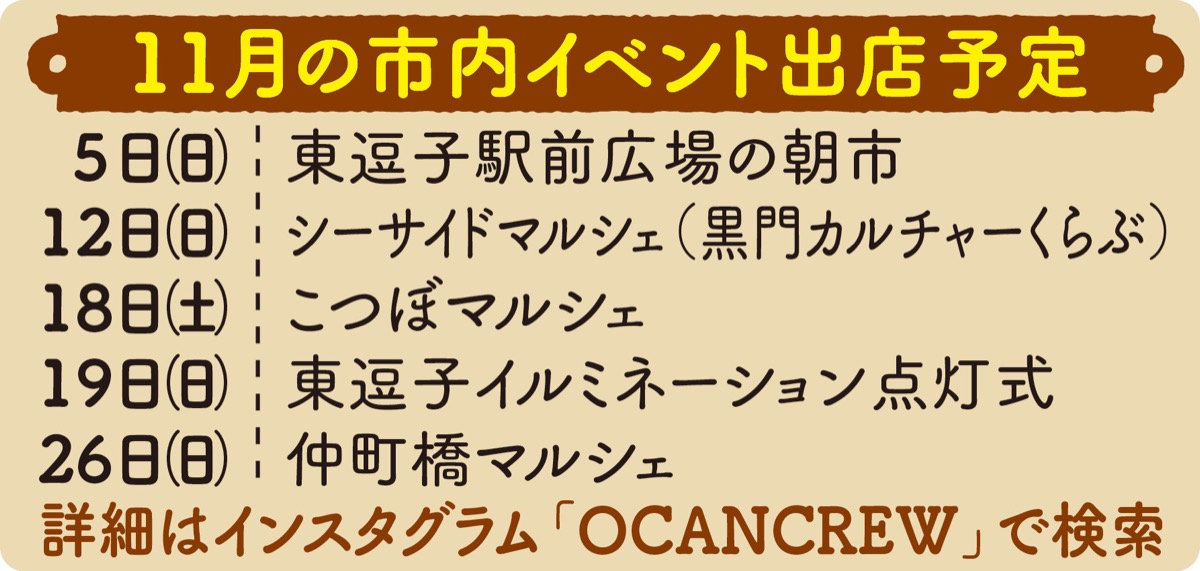 運営するのは、母親の集まり「YES!O CAN(イエスオカン)」。逗子市商工会が貸し出すキッチンカー「ドリームキッチン」を使用し、来年1月末までの3カ月間、平日は逗子市役所前、週末は各地のイベントで料理の腕を振るう。11月中は表のようなスケジュールでイベントに出店する。