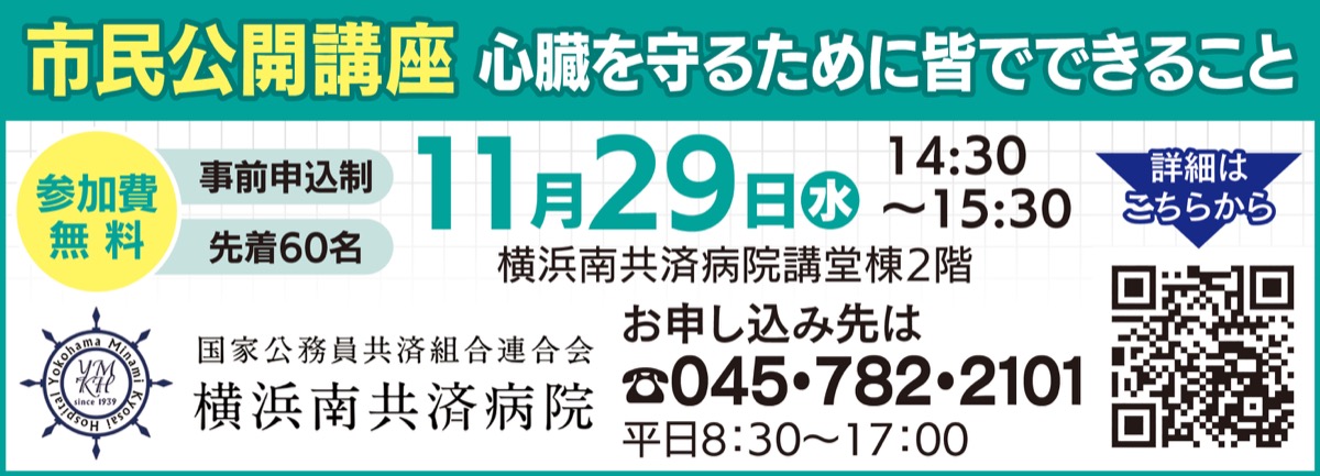 横浜南共済病院は11月29日(水)、市民公開講座「心臓を守るために皆でできること」を開催する。会場は同院講堂棟2階。午後2時30分から午後3時30分。事前申込制、定員先着60人。