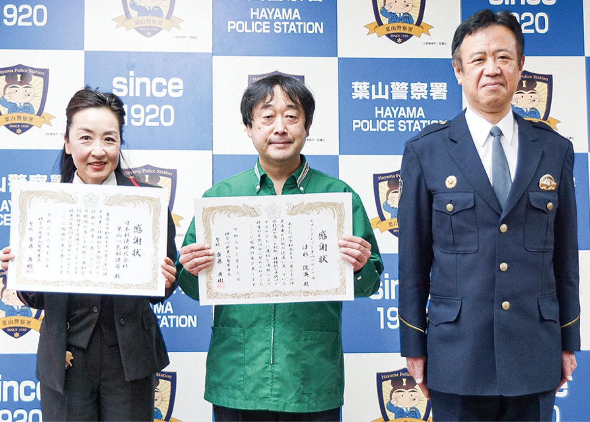 特殊詐欺被害を防止したとして、葉山警察署(齋藤英樹署長)は2月16日、セブン―イレブン葉山マリーナ店勤務の清水俊英さんと葉山一色郵便局に感謝状を贈呈した。