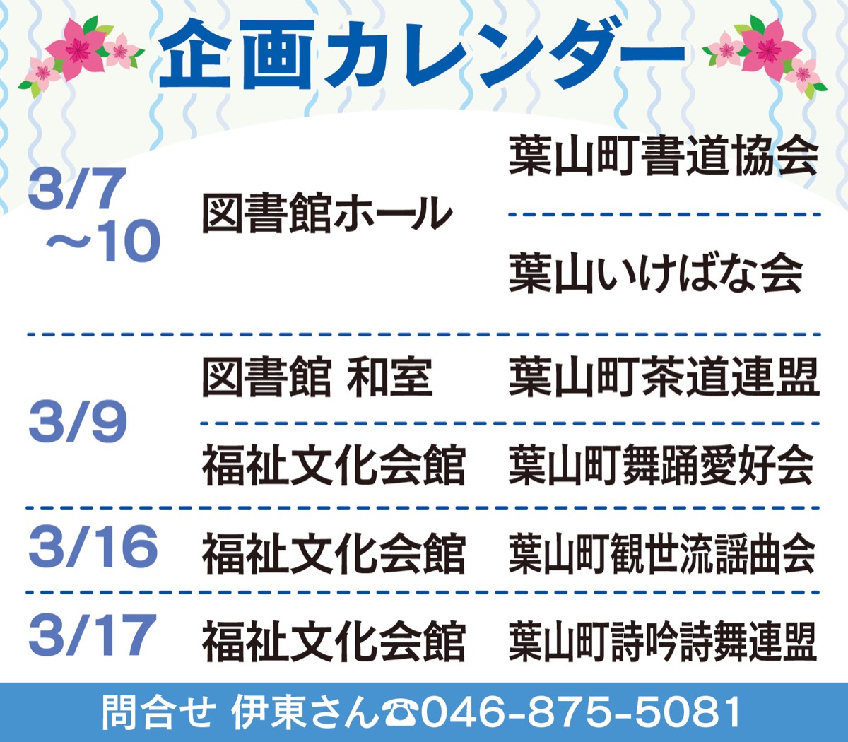 図書館では3月7日から10日(日)、ホールで葉山町書道協会が一般公募作品と子どもの作品を展示する。葉山いけばな会も同日の発表。普段は各流派で活動する、草月流、新未生流、小原流、池坊、嵯峨御流が一堂に会する。和室では葉山町茶道連盟が呈茶を行う。菓子が無くなり次第終了。