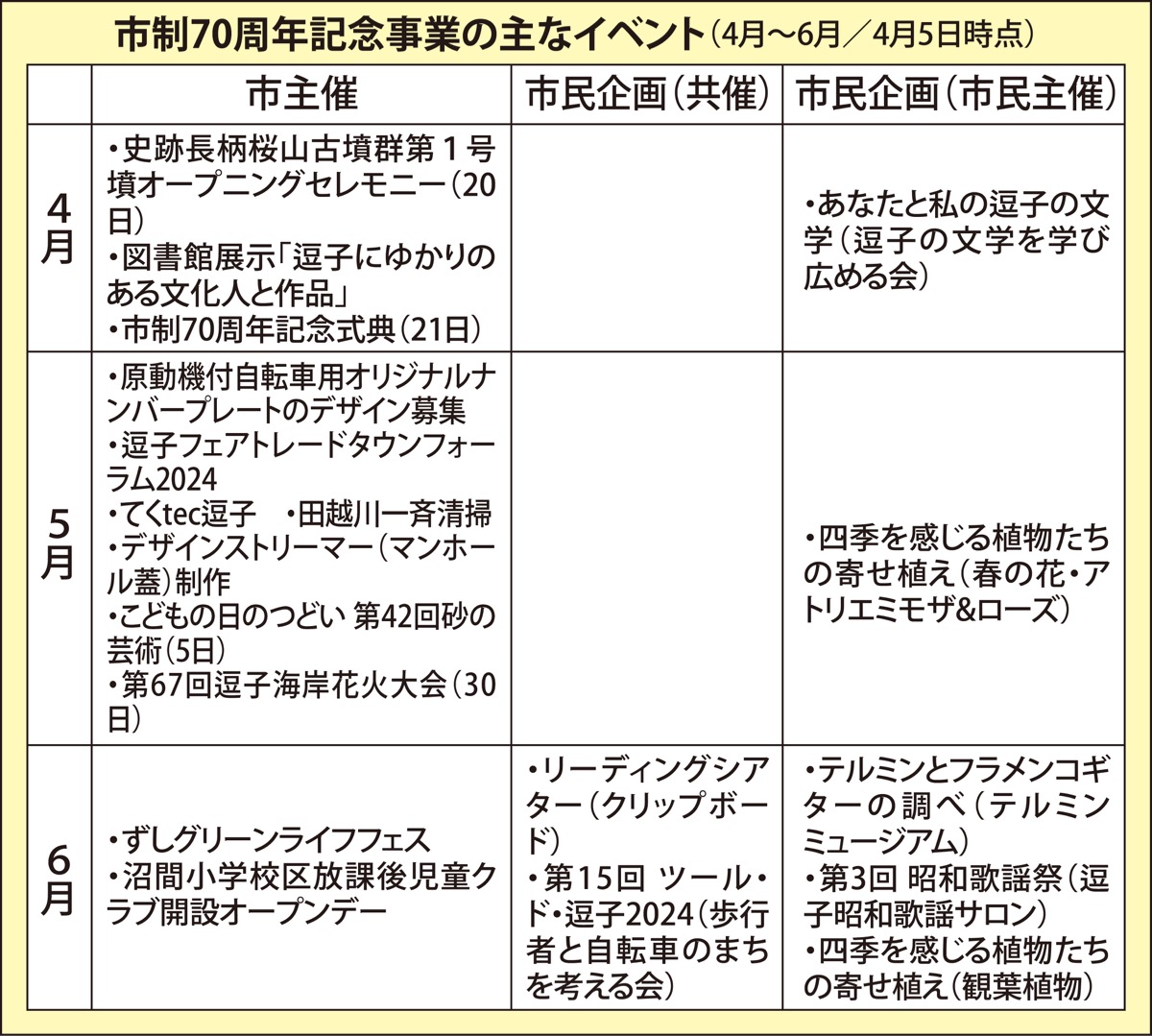 逗子市は4月15日(月)に市制70周年を迎える。それに伴い21日(日)には逗子文化プラザなぎさホールで、記念式典が開催される。