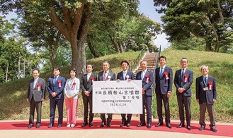 逗子市と葉山町にまたがる史跡長柄桜山古墳群第一号墳の整備完了に伴うオープニングセレモニーが4月20日、現地で行われた。桐ケ谷覚逗子市長、山梨崇仁葉山町長をはじめ、両市町ゆかりの議員や市町民など約180人が参加し、1600年の時を超えた古墳の公開を祝った。