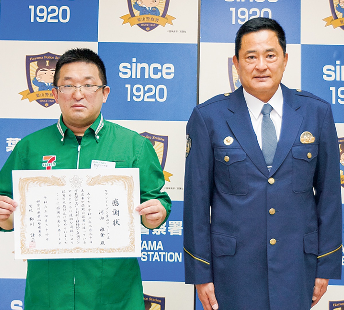 セブンイレブン葉山マリーナ店勤務の河内雅登さん(42)は特殊詐欺被害を阻止したとして4月24日、葉山警察署から感謝状を贈呈された。