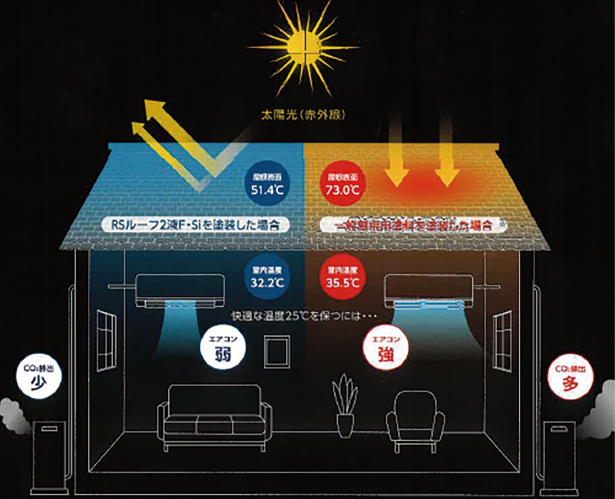 屋根は直射日光が当たると表面温度が上昇し、それによって建物内も暑くなる。一般的な屋根塗料を使った場合、屋根表面の温度は73度にまでなるが、同社が取り扱う遮熱塗料の場合、51・4度まで抑えられるというデータがある。室内の温度では約3度の差が出るという。