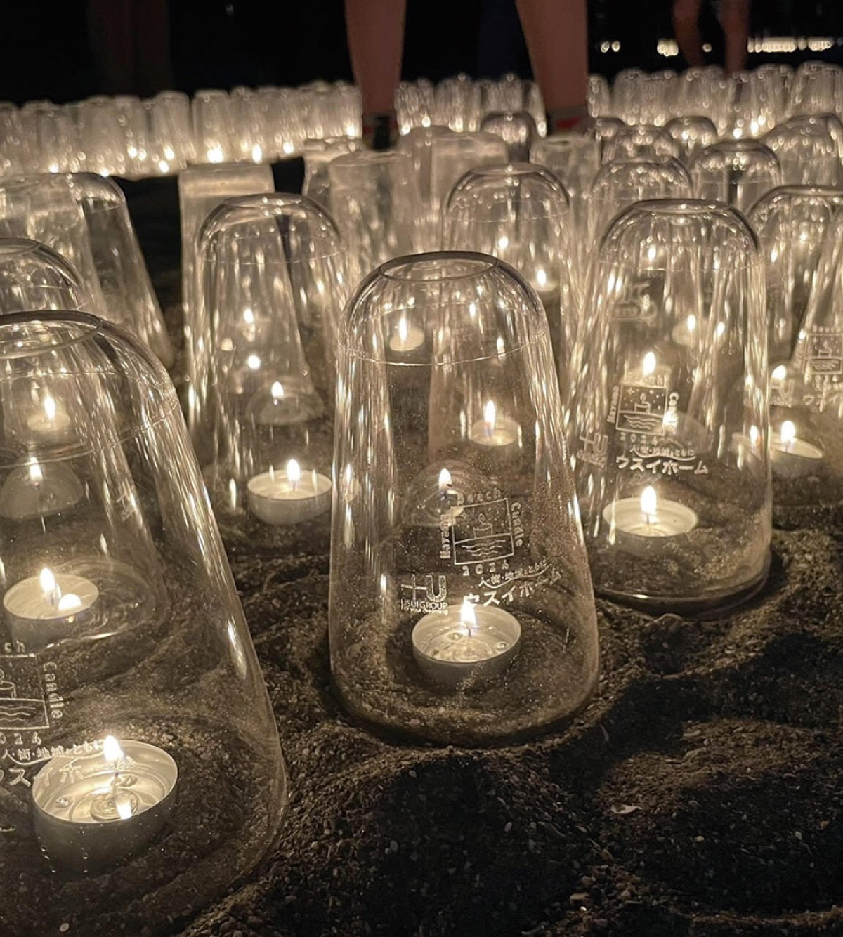 その一環で、5月18日に葉山町100周年を記念した「Hayama Beach Candle」を森戸海岸で開催。約5000個のキャンドルで砂浜に葉山町100周年ロゴマーク、富士山、鳥居、ヨットを描いた=写真右下。そのキャンドルのカバーには従来までのプラスチックカップに替え、衝撃や熱に強く、繰り返し使えるポリカーボネート性のカップを使用し=写真左下、プラごみの削減を実践した。
