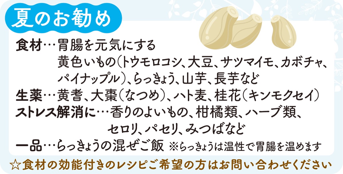 今年の夏は40度を超す地域が続出しています。この暑さについ冷たいものを飲みすぎたり、食べすぎたりしがちですね。胃に冷たい刺激を受け続けると、胃腸は疲れてしまい、がぶ飲みした水を吸収できなくなり、食欲不振や胃もたれ、下痢などの症状や、「気」を作り出せず、疲労を誘発します。胃腸の元気が夏バテ予防の鍵です。