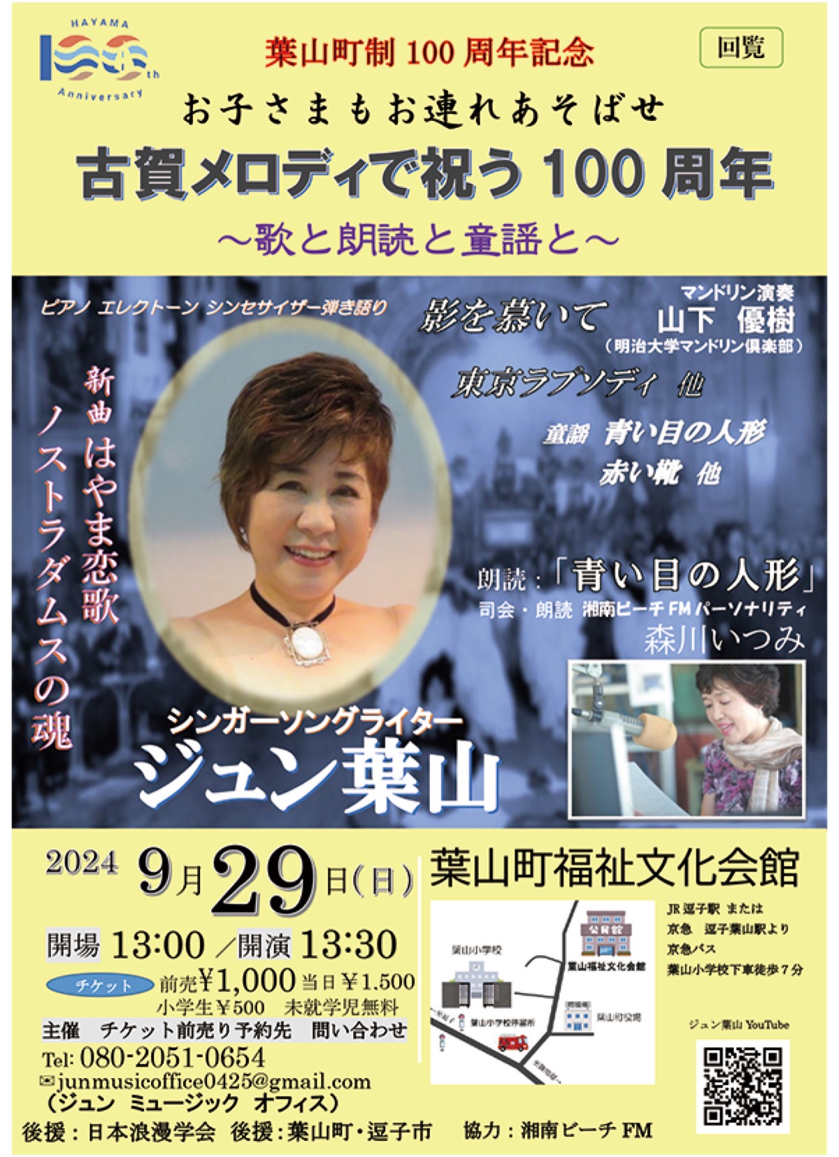 葉山在住のシンガーソングライター、ジュン葉山さんが9月29日(日)、葉山町福祉文化会館で「古賀メロディで祝う100周年〜歌と朗読と童謡と〜」と題したコンサートを行う。