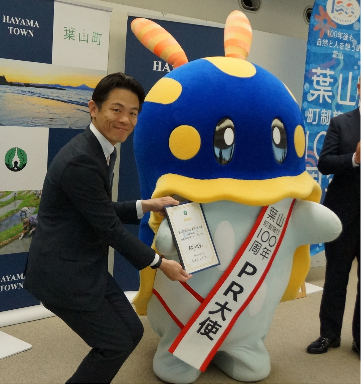 葉山生まれのアオウミウシのキャラクター、「Myusy(ミューシー)」=写真【5】=が3月1日、「葉山町制100周年PR大使」に就任した。町内で行われる各種イベントにひっぱりだこ。しゃべったり、尻からシャボン玉を出したりして、子どもばかりでなく、大人からも大人気だった。