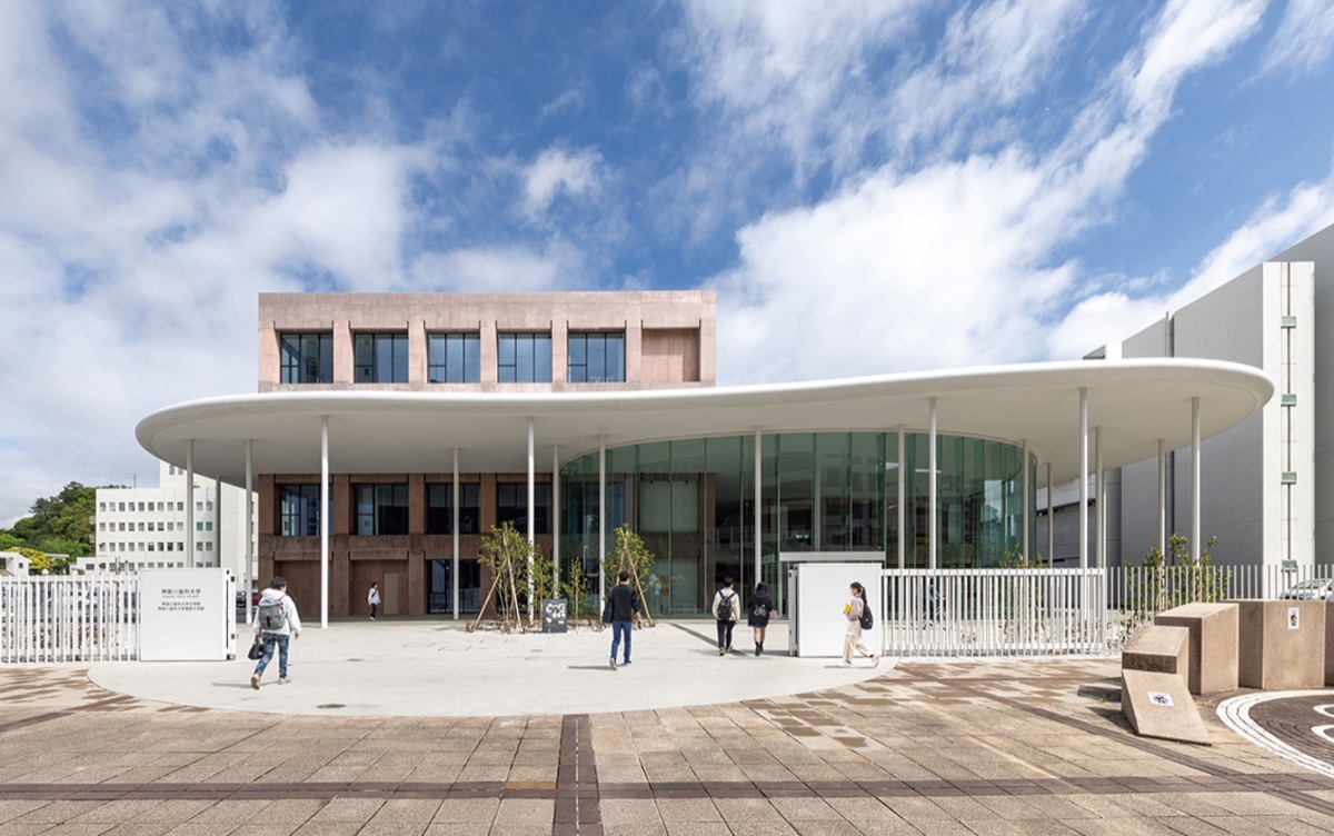 「昨年末に飛び込んできた嬉しいニュースです。権威あるアメリカの国際的建築デザイン賞である『The Architecture MasterPrize』で日本で唯一、教育施設部門での評価を受けました。事務機能と学生の居場所を兼ねた施設は、雲をイメージした大屋根とカラーコンクリートを用いた外壁のトワイライトピンクが特徴です。季節や時間、挿し込む光の角度によって様々な表情を見せてくれます。デザイン性だけでなく、周辺環境との調和や学生の使い勝手も認められました。24時間の施設開放は、各自の生活スタイルに合わせて勉強時間を確保してもらうためです。多くの学生が利用していますが、外から丸見えのガラス張りは見られている緊張感があり、集中力を高める効果があるようです」