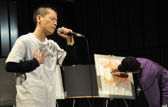 横須賀市でアートバトルイベントを展開している団体とのステージコラボもあり、ラッパーが発するメッセージを受け取って即興で絵を作成する実験的なパフォーマンスもあった。