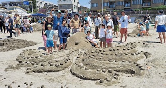 海岸の砂や貝殻を使って立体アートを作る「砂の芸術」がこどもの日の5月5日、逗子海岸(東浜)で行われた。逗子市が主催するこどもの日の恒例行事で今回の開催で43回目。