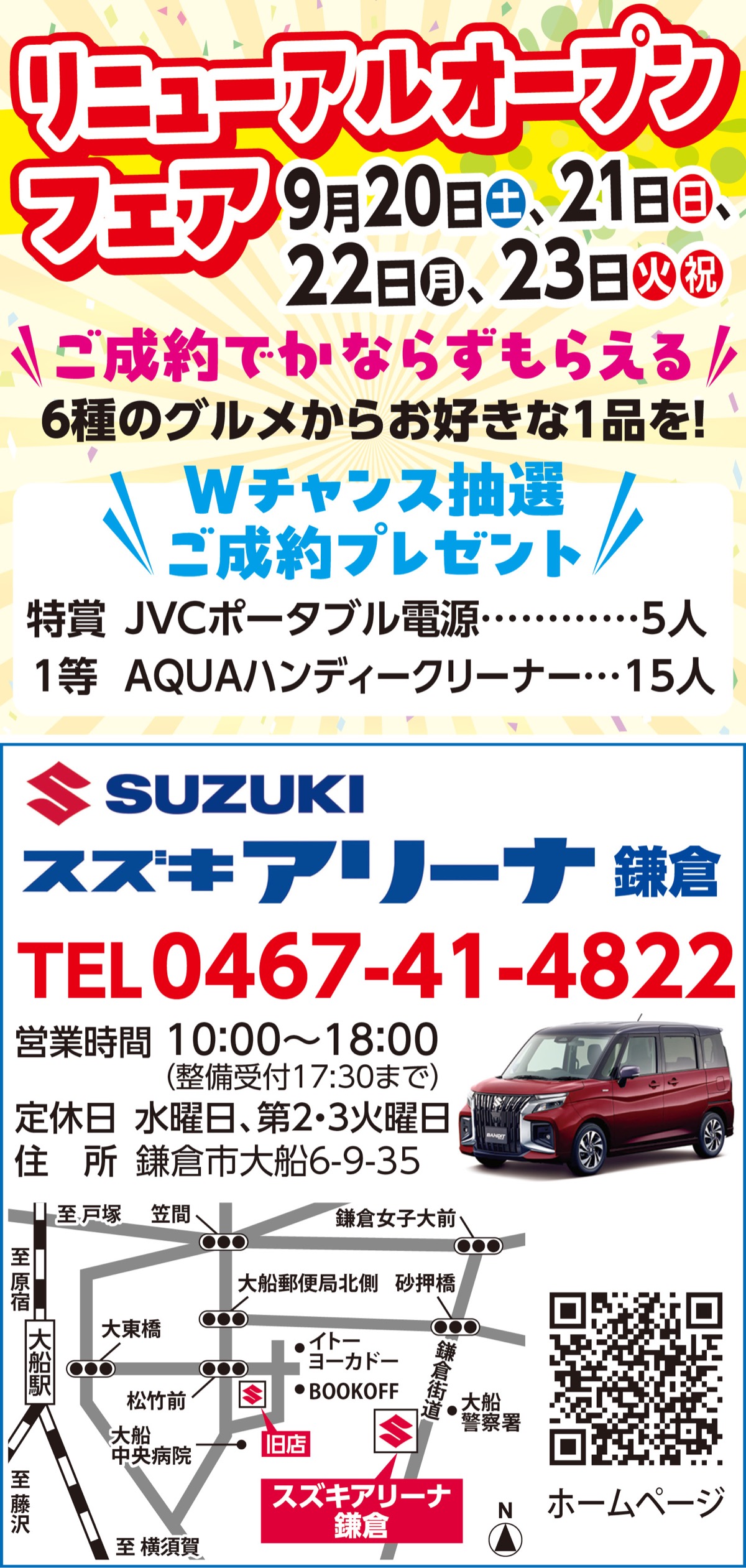 スズキアリーナ鎌倉(鎌倉市大船6の9の35/(株)スズキ自販神奈川)が9月20日(土)、鎌倉街道沿い大船警察署そばにオープンする。これまで旧店舗(鎌倉市大船2の25の11)で新車販売や車検・点検に対応してきたが、車で5分ほどの新店舗へ移転。リニューアルオープンとなる。