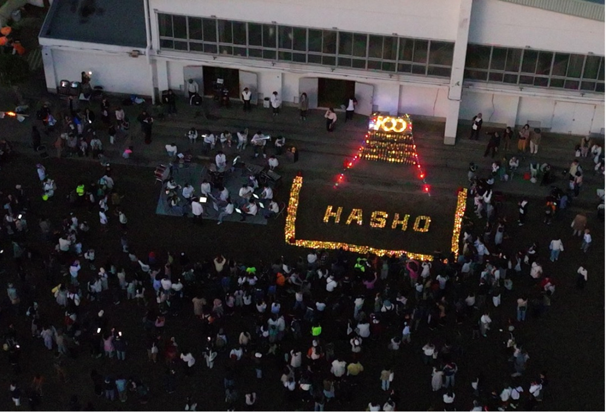 体育館の前には三浦竹友の会の協力で作られた竹ランタンのオブジェが飾られ、夕闇に「100 HASHO」の文字が浮かび上がった。