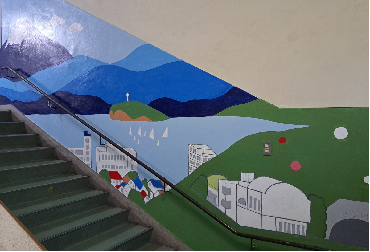 また、記念事業として階段のアートペイントを実施。地元業者の協力を得て壁を塗り替え。校内で募集したデザインをもとにPTAが原画を作成し、全児童が参加して1階から3階までの壁面に富士山や海、山の動物などを色鮮やかに描いた。