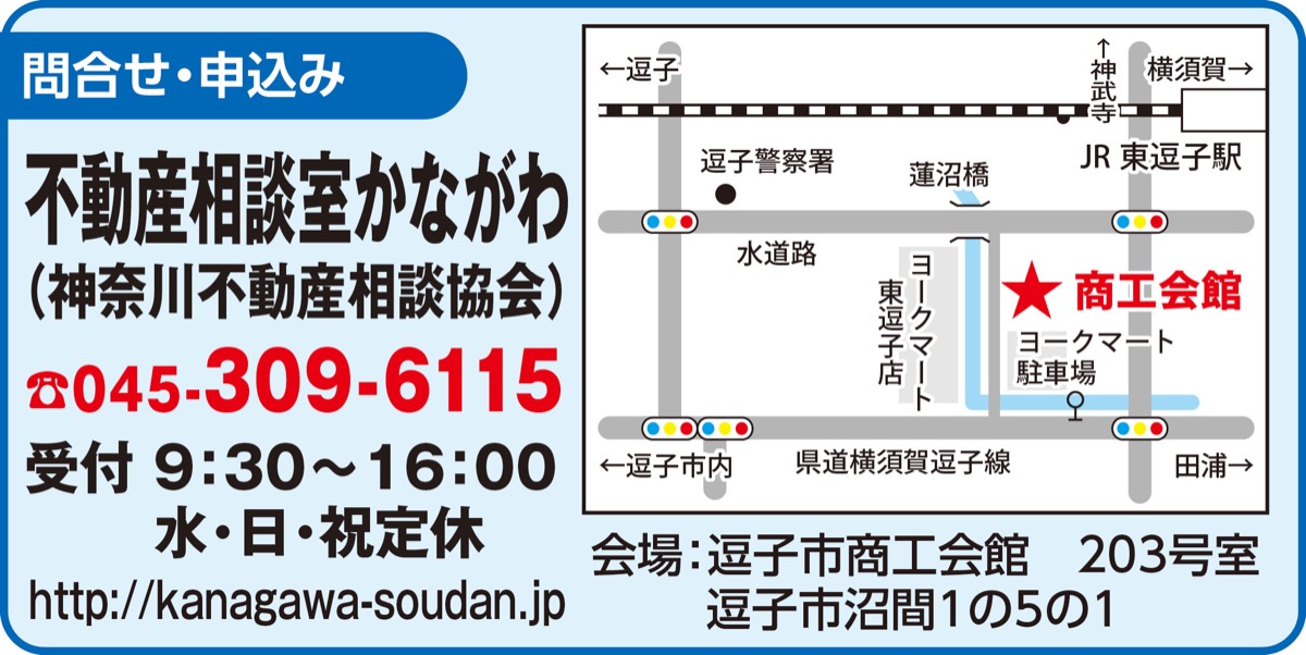 「不動産相談室かながわ」が、毎月各地で開催している相続と不動産に関する無料相談会。12月は13日(土)、逗子市商工会館203号室で開かれる。