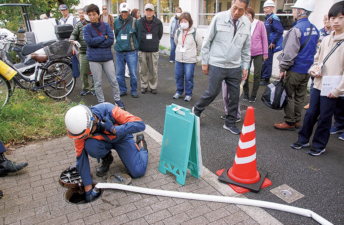 今回、災害時に上水道が断水し、水洗トイレが使用できなくなった場合に活用する「マンホールトイレ」に初めて川の水を利用する訓練が行われた。かつてはプールの水を使用していたが、プールがなくなってからは貯水タンクの水の使用が前提となっていた。同小に設置されている貯水タンクの容量は6t。生活用水として約3日分とされているが、市防災安全課の担当者によれば、マンホールトイレを流すのに1日約2t、他に清掃などでの使用を加味すると3日間で10t近い水量が必要となる。そこでプールの水の代替案として川の水の活用が取り入れられた。