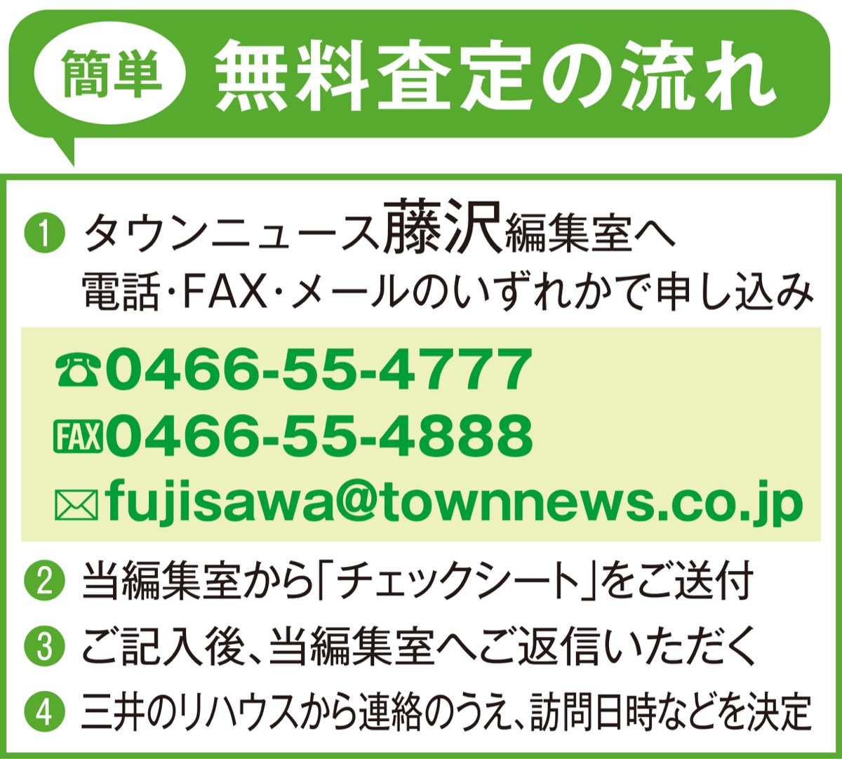 今回は三井のリハウスとタウンニュースが協力し、資産価値を無料でお見積り。希望者は担当窓口の本紙・藤沢編集室へお問合せの上、当方から送付する「チェックシート」に記入し返送するだけ。締切は2月15日(日)。家族の将来設計のために、大切な資産価値を確認してみては。