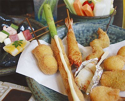 旬の夏野菜をふんだんに取り入れる自慢の串揚げが、夏休み特別企画としてなんと最大20%オフに(ランチは10%オフ、いずれもドリンクは対象外)。さらに、7月末まではディナー限定で、「プレミアムハイボール」または、「季節のアイスクリーム」をサービス(どちらか1人1品)。※サービスは本紙持参。夏休みの家族会や友人と、また同窓会などにもうれしい内容だ。