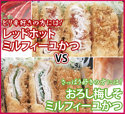 数々のTV・雑誌で話題の人気店「とんかつ&サラダバーよしかつ」では、「ミルフィーユかつ対決」を開催。スパイシーなカレーパウダーが食欲をそそる「レッドホットミルフィーユかつ」VS梅肉としそを挟み、さっぱりとした味わいの「おろし梅しそミルフィーユかつ」から目が離せない。