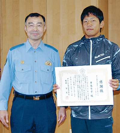 藤沢警察署は先月22日、海水浴場で置き引きを捕まえたとして東海大学1年のライフセーバー井本草平さんに感謝状を贈った。