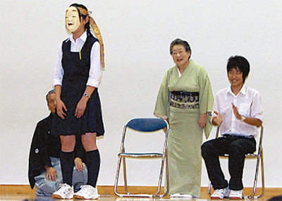 実演では、同協会の女性メンバーによる仕舞「羽衣」と、男性メンバーによる連吟「屋島」を披露。発表の最後には、同校の生徒2人がステージに立ち、能面をつける体験も。歩いたり、面をつけたままマイクなしで校歌を歌うと、会場からは手拍子が起こっていた。体験した生徒は「全然見えなくて怖かったけれど、能面の角度によって表情がわかるのはすごいと思った」「能を聞いたのも体験したのも初めてだったけれど面白かった」と感想を話した。