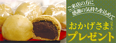 感謝の気持ちを込め、ご来店のお客様に人気の黒糖饅頭「おかげさま(2ヶ入)」をプレゼント。その他、お買い得商品あり。「たくさんお渡しできるようにご用意させていただきますが、手作りのため数に限りがございます」と岡崎店主。