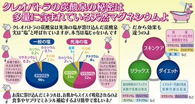 湯乃市のクレオパトラの炭酸泉には、クレオパトラが愛した天然マグネシウム(死海の塩)が豊富に含まれています。「奇跡のスーパー健康ホルモン」と言われるアディポネクチンの増加が報告され、糖尿病や高血圧、動脈硬化や肥満を予防改善するだけでなく、肌にも良い影響を与え、アンチエイジングの切り札との呼び声も高いほど。テレビの健康番組でも数多く取り上げられ、広く知られています。