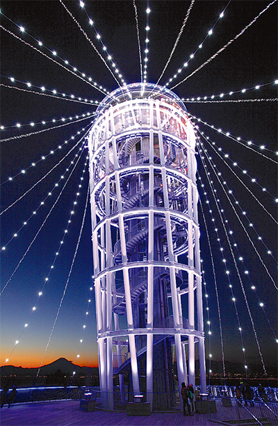 使用されるLED電球は約10万球。東日本大震災に伴う節電対策として昨年の13万球から縮小したが、江の島島内に電球を集約させたため、例年以上に迫力あるイルミネーションが楽しめる。特にシーキャンドルから吊り下げられる電飾は、直径60mの「光の大空間」。360度に広がった空間の中に入ることは、全国でも珍しい体験になるという。