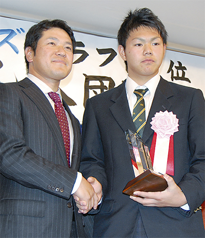 花束贈呈では、湘南クラブの小笠原慎之介選手、善スポ少年団の宮島滉平選手が激励の花束を渡し、「プロでも野球頑張ってください」「プロで待っていてください」と言葉をかけると、高橋選手は笑顔で受け取っていた。