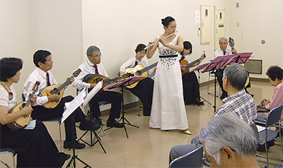 コンサートでは、吉川久子さんのフルート演奏や、湘南マンドリン・ギターアンサンブルのメンバーとのアンサンブルが披露され、「さくらさくら」や「見上げてごらん夜の星を」、「また君に恋してる」など15曲が演奏された。
