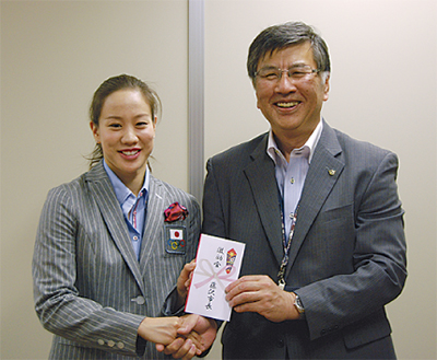 この日訪れたのは、酒井選手と神奈川県水泳連盟シンクロ委員会の梁瀬千鶴委員長、酒井選手の母・敦子さんの3人。酒井選手は、厳しかった五輪予選を振り返り「最後は気持ちがどのチームより勝った」と話し、「本番では、気持ちのこもった人を感動させるような演技をしたい」と決意を語った。