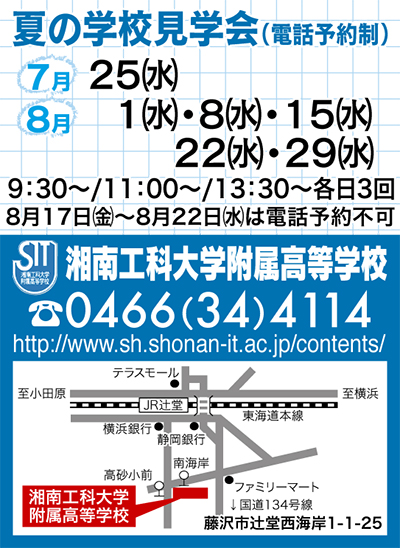 受験生にとっては本格的な学校選びが始まる夏休み。湘南工科大学附属高等学校では、学校見学会を以下の日程で開催する。同校について、より詳しく知りたいと考えている中学生と保護者の方が対象。