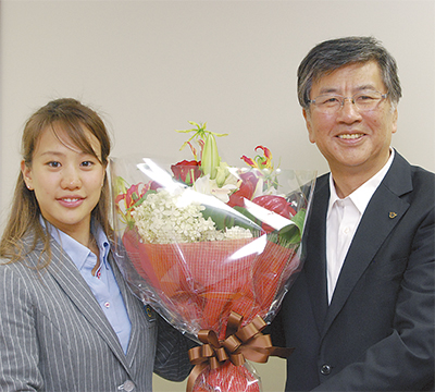 ロンドン五輪に出場した、シンクロナイズドスイミング日本代表の酒井麻里子選手が8月30日、鈴木恒夫藤沢市長を訪れ、大会結果を報告した。