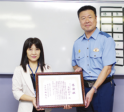 株式会社ダスキン藤沢(鈴木哲男代表取締役社長)湘南台支店に勤める高椋(たかむく)栄子さんが振り込め詐欺を未然に防止し、9月24日に藤沢北警察署(池田光夫署長)から感謝状を贈られた。