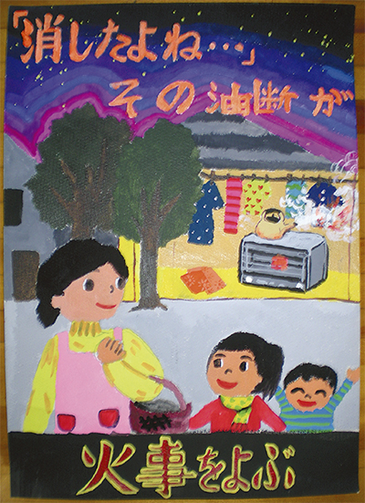 大川さんの作品は、「はなれるな!その油だんが火事になる」という標語で、よそ見をして電話する女性の後ろで、コンロが火に包まれる様子を描いたもの。