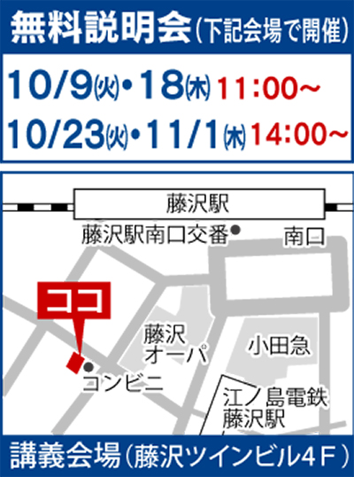 県内各地で介護関連人材の養成を行っている、かながわ福祉保健学院では、11月よりヘルパー2級講座を開講。(株)へいあんと共催のため、今回の講座に限り、特別受講料60000円(税込)に。期間は、11月6日〜12月22日まで(講義・演習8回、他に実習4日間)時間は、9時30分〜17時15分。講義会場は、藤沢ツインビル4F(駅3分)。実技会場は、へいあん亀井野デイサービスセンター。まずは無料説明会へ。資料請求・問合せは左記へ。