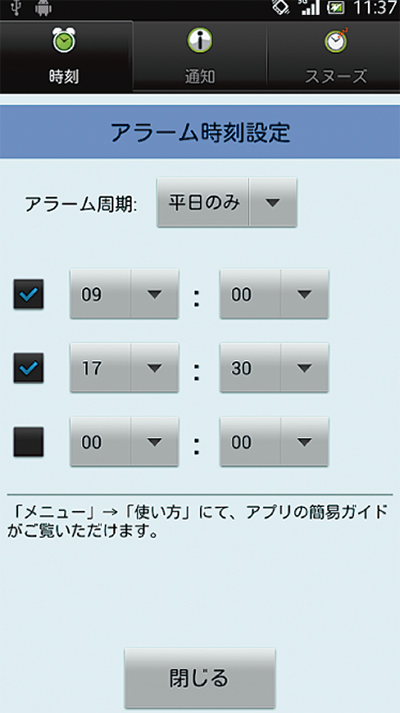 特徴は、アラームが鳴ったとき、画面のどこをタッチしても反応する点。スマートフォンの大きな画面の利点を活かしている。