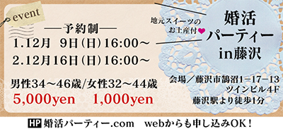 「婚活パーティー」が12月9日(日)、12月16日(日)、「藤沢市鵠沼1の17の13ツインビル4F」で開催される。