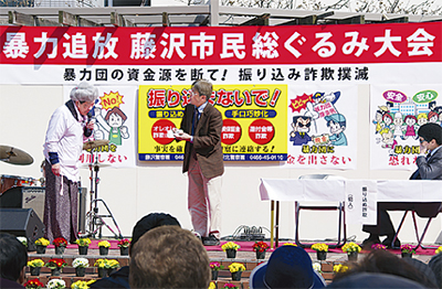 ステージでは、主催の藤沢暴力追放推進協議会(田中正明会長)が展開している「暴力団根絶3ない運動」の標語「暴力団を恐れない、金を出さない、利用しない」を藤沢北警察署管内暴力団排除対策推進協議会の川口勇会長が宣言。市民に注意を促し、暴力団根絶の決意を語った。