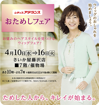 全国各地で大好評の「レディスアデランスおためしフェア」が4月16日(火)まで、さいか屋藤沢店7階催物場で開催中だ。このイベントは、人気の女性用ウィッグを無料で試着できる展示試着会形式の催事。普段ウィッグを手に取ることの少ない人はもちろん、ヘアアレンジを手軽に楽しみたい人には絶好のチャンスだ。
