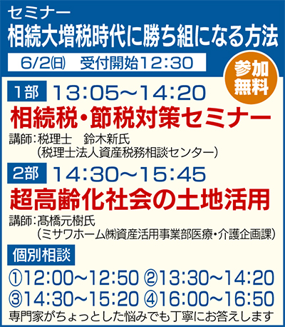 土地活用で今気になるのは相続税の増税。その節税対策や資産有効活用法は、ぜひ知っておきたいもの。 資産税務相談センターとミサワホームは6月2日(日)、資産活用に役立つセミナー「相続大増税時代に勝ち組になる方法」を開催する。場所は辻堂駅前のオザワビル。定員30人で予約制。 当日は、税理士が分かりやすく教える「相続税・節税対策セミナー」と、今の土地活用を伝える「超高齢化社会の土地活用」の2部構成。税制改正の要点や節税法、話題の介護福祉施設による土地活用法などが学べる。個別相談もあり。