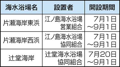 7月1日(月)の午前10時から片瀬海岸東浜で江の島海水浴場の「海開き」が開催される。海開きでは、恒例のくす玉割やレスキュー隊によるデモンストレーションなどが行われる。また、ふじさわ観光親善大使のつるの剛士さんも登場する。