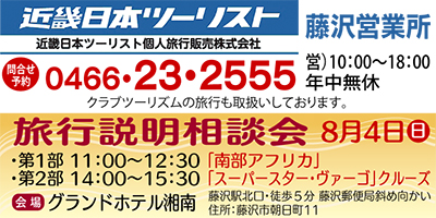近畿日本ツーリスト藤沢営業所では、旅行説明会を8月4日(日)に藤沢駅北口のグランドホテル湘南で行う。参加無料、予約は電話で。