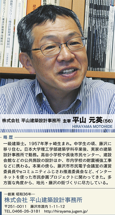 藤沢の新たな産業拠点や交流ゾーンの核として、2014年3月に完成予定の「藤沢商工会館(愛称・ミナパーク)」。設計を手掛けた(株)平山建築設計事務所の主宰・平山元英氏に新たな産業拠点への思い、湘南の街づくりについてインタビューを行った。