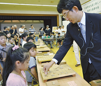 講演後、佐藤九段は公募で集まった小・中学生36人を相手に指導対局。各1時間2回に渡って、多面差しを行った。子どもたちは、真剣な表情で勝負に挑み、より効果的な駒の動かし方や戦略などのアドバイスを受けていた。小学生の女児が九段を打ち負かし、「負けました」と言わしめると、会場内をどっと沸かせていた。